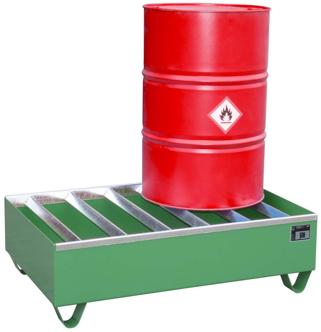 Gefahrstoffwanne resedagrün pulverbeschichtet mit Fassauflage - Stahlwanne mit 224 Liter Auffangvolumen