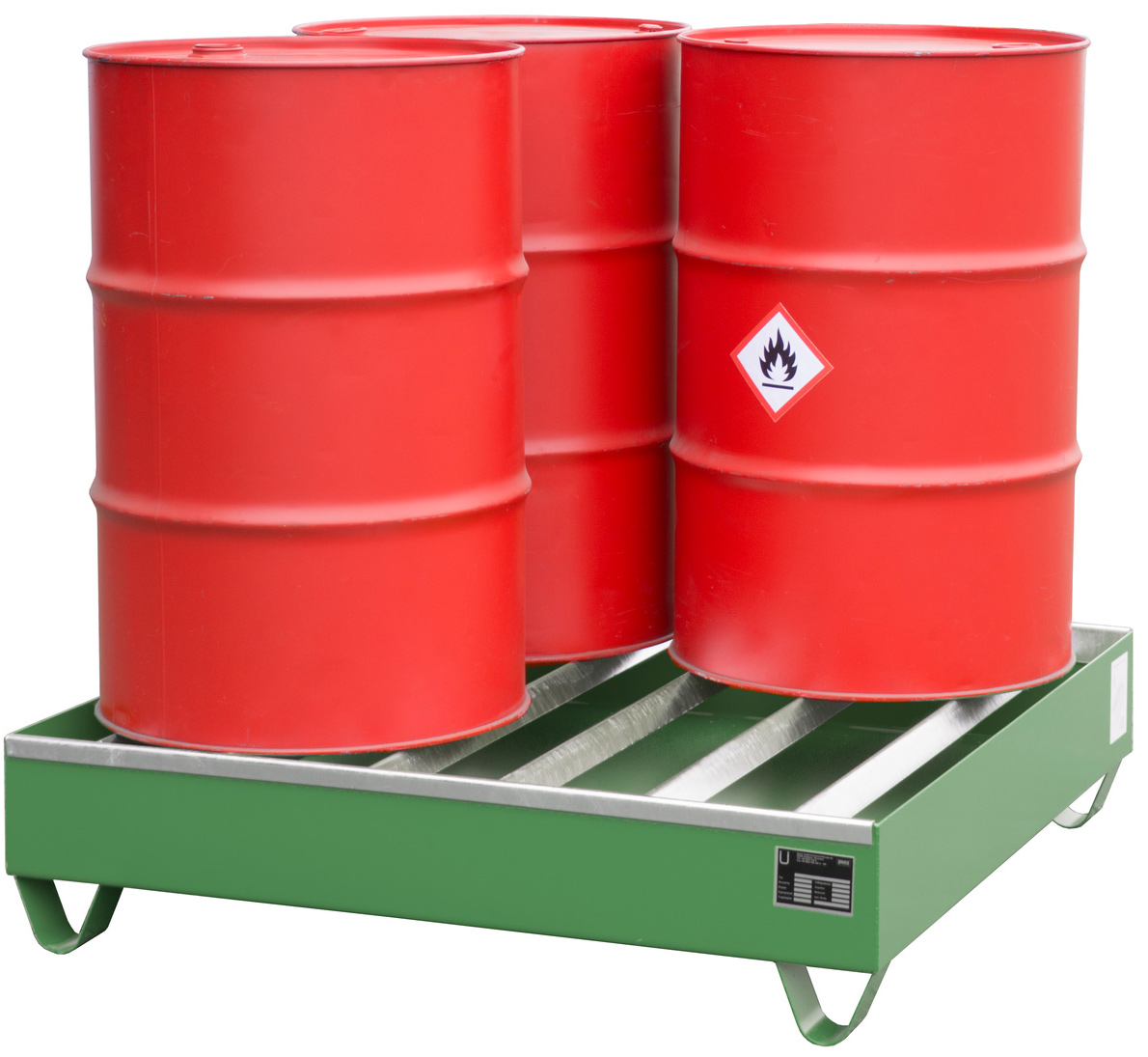 Gefahrstoffwanne resedagrün pulverbeschichtet mit Fassauflage - Stahlwanne mit 230 Liter Auffangvolumen