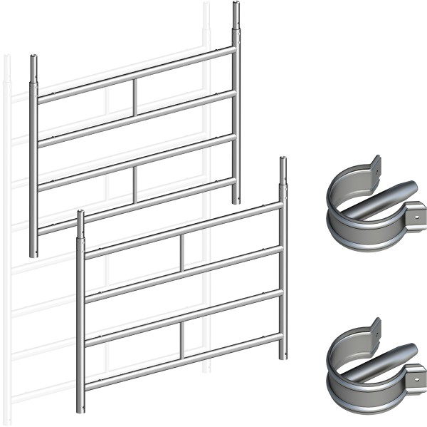In der Ausführung mit Telegeländern entspricht das Gerüst der aktuellen Fassung der DIN EN 1004 sowie den geltenden europäischen Arbeitsschutzgesetzen in vollem Umfang. Durch die teleskopierbaren Geländer (von ca. 1,80 m bis 2,85 m) kann die nächste Ebene komplett und gesichert bereits aus der unteren Lage aufgebaut werden und ein ungesichertes Einhängen der Knieholm-Geländer entfällt. Die Aufbauvariante P2 mit Telegeländer realisiert die Schutzmaßnahme ohne Zwischenschritt im Bereich der Durchstiegsklappe beim Auf- und Abbau. Dadurch kann auch die Montage zusätzlich beschleunigt werden.