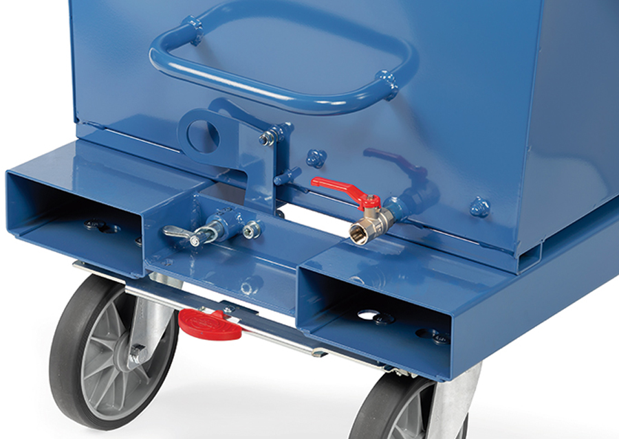 Der Muldenkipper von Fetra eignet sich für mittlere Belastungen und verfügt über eine kippbar gelagerte Mulde aus Stahlblech mit einem umgekanteten Rand, ein Trittblech, eine Kippsicherung und einen Rohschiebegriff. Das Untergestell des Transportwagens ist aus Kantenprofilen mit integrierten Staplertaschen und ein integrierter Ablasshahn mit Sieb trennt Flüssigkeiten von Feststoffen. An der Unterseite befinden sich zudem zwei Lenk- und zwei Bockrollen mit TPE-Bereifung und einem TOTALSTOP-Zentralbremssystem an den Lenkrollen.