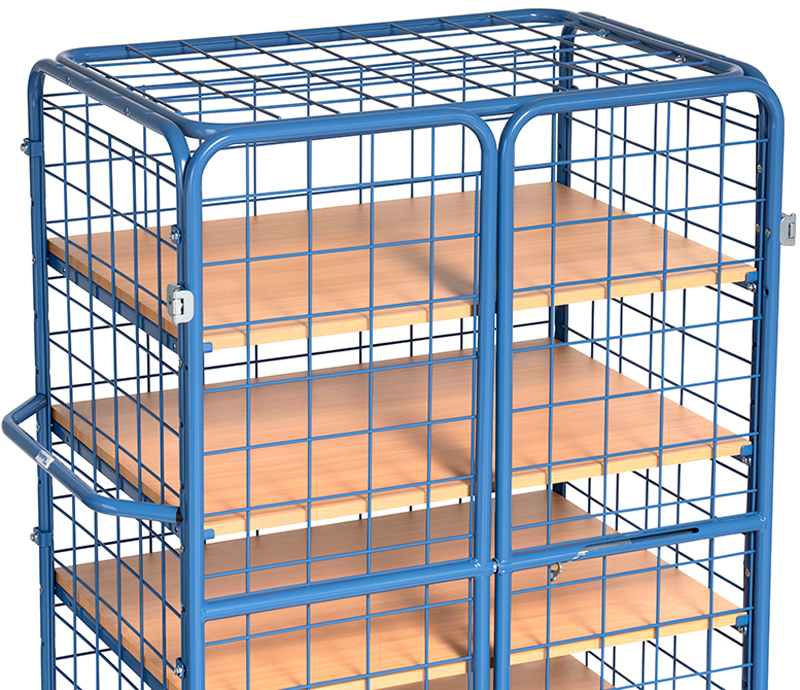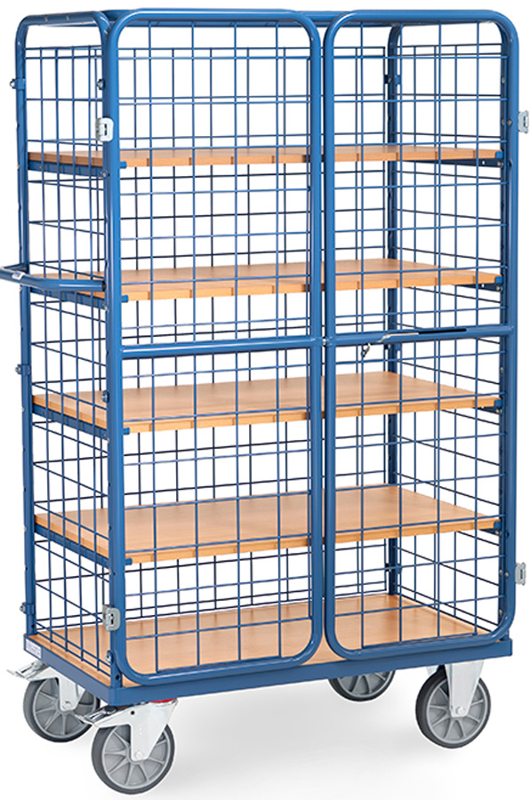 Der Fetra Paketwagen verfügt über zwei Stirnwände, eine Längswand und eine Doppelflügeltür an der offenen Längsseite aus Drahtgitter. Die einzelnen Türflügel können an die Stirnwände geklappt werden und nehmen somit keinen zusätzlichen Platz ein. In dem Rohrrahmen der Doppelflügeltür befindet sich ein integrierter Riegelverschluss, welcher mittels eines Vorhängeschlosses abgeschlossen werden kann. Der Transportwagen ist außerdem mit einem Dach aus Drahtgitter und einer Plattform aus Holzwerkstoffplatten ausgestattet und eignet sich somit ideal zum Pakettransport.
