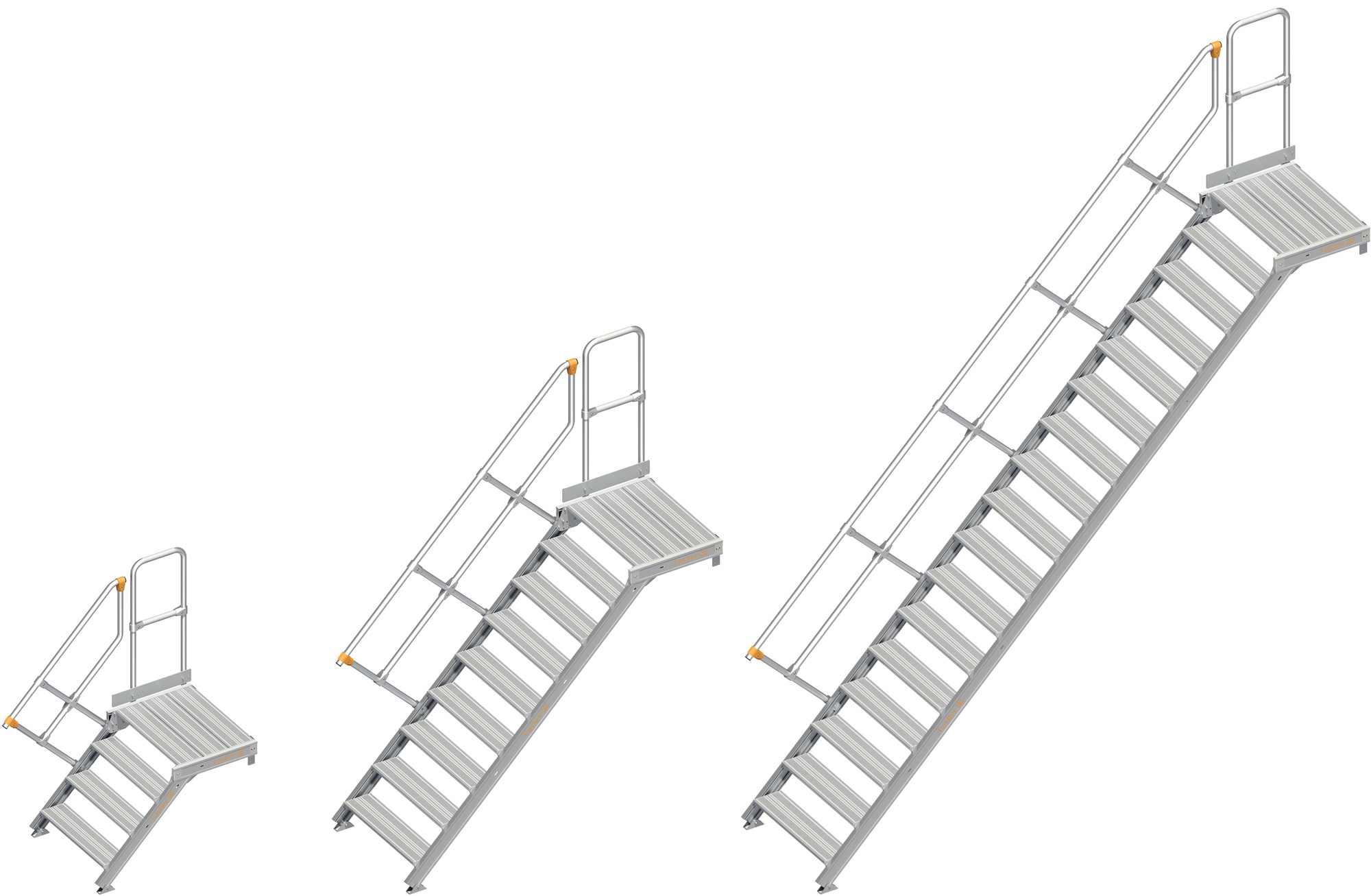 Je nach Variante sind entweder ein ein- oder beidseitiges Treppengeländer vorgeschrieben, welche für einen guten Halt sorgen und im Notfall als Absturzsicherung dienen. Optional gibt es die Treppen mit einer Neigung von 45° oder 60° und mit einem Stahlgitterrost oder geriffeltem Aluminium als Standfläche. Beide Varianten wirken rutschhemmend und garantieren auch bei Feuchtigkeit und Nässe einen festen Stand.