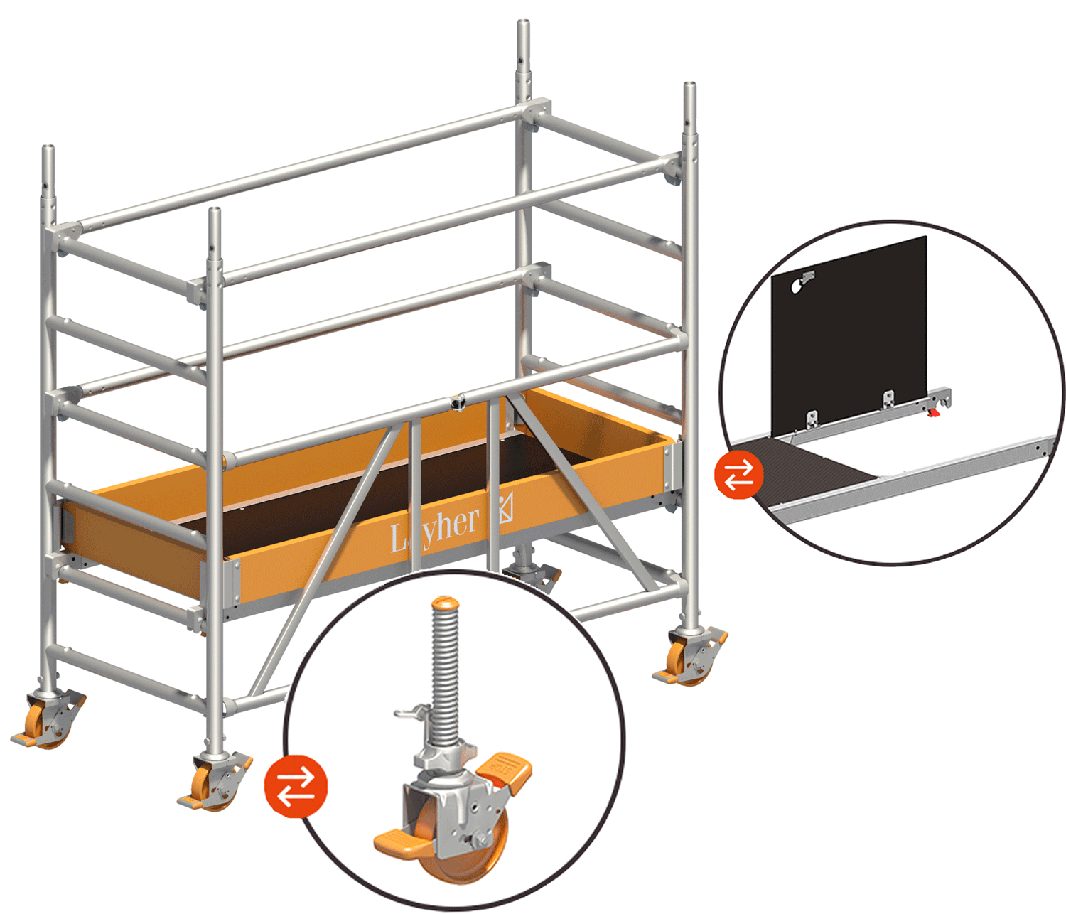 Layher bietet Ihnen ein umfangreiches Produktsortiment zum sicheren Höhenzugang an. Zu diesen Produkten gehören unter anderem Leitern, Gerüste, Podeste und Treppen aus unterschiedlichen Materialien, wie beispielsweise Aluminium, Gummi, Kunststoff und Holz.