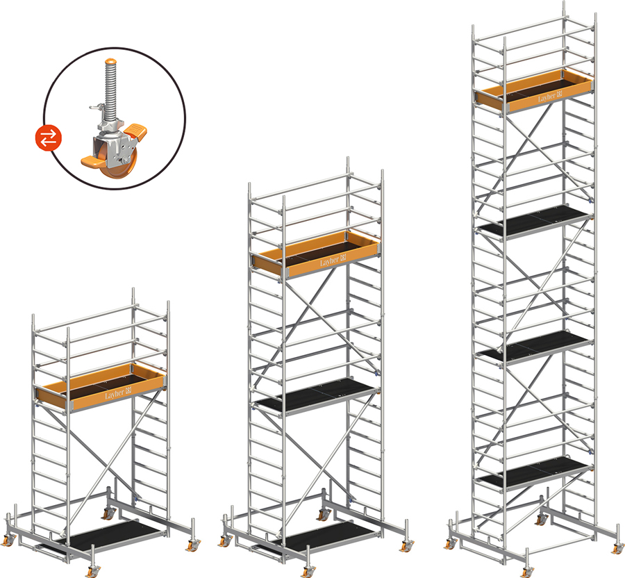Neben den Leitern bietet Layher außerdem zahlreiche Zubehörelemente und Ersatzteile, sodass die Steigtechniken jederzeit angepasst, ergänzt und repariert werden können. Dachrinnenhalter, Einhängehaken oder Fahrgerüstteile lassen sich mühelos in kurzer Zeit montieren und erfüllen den individuellen Bedarf.