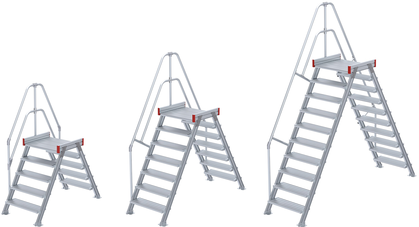 Podesttreppen aus Aluminium oder Stahlrohr lassen sich leicht montieren. Als Zubehör werden Dreieckskonsolen oder Stützen mitgeliefert, die für die nötige Standsicherheit sorgen. Dort, wo nur zeitweise ein Höhenunterschied zu überwinden ist, hat sich der Einsatz einer fahrbaren Plattformtreppe bewährt. Diese besteht aus einer Plattform in der gewünschten Arbeitshöhe, die über eine Treppe zu erreichen ist. Ausgestattet wird diese spezielle Treppe mit robusten Rädern.