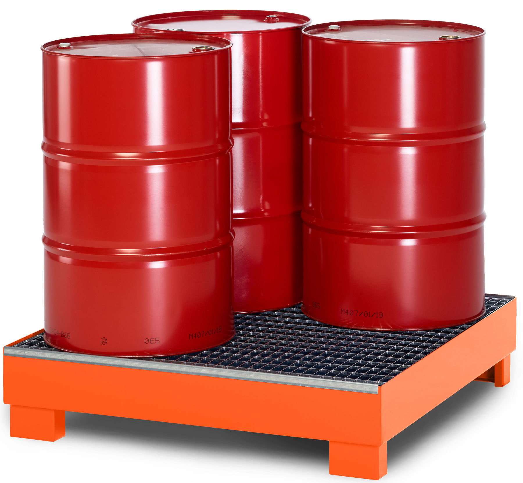 Stahlwanne mit Gitterrost für 4 x 200 Liter Fässer - Gefahrstoffwanne reinorange pulverbeschichtet