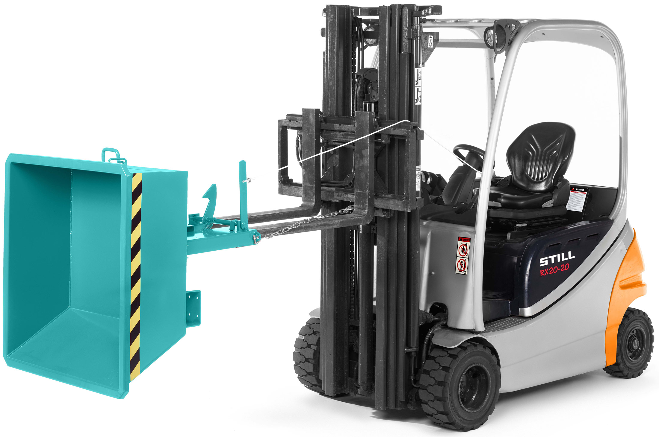 Der Minikipper RMI-15 für Gabelstapler von RR Industrietechnik hat kompakte Abmessungen und kann so kleinere Güter einfach und schnell transportieren oder sammeln. Mit niedriger Bauhöhe lässt sich der Kipper problemlos an Maschinen oder Einfahrten, in Nischen unterstellen. Direkt vom Staplersitz kann die Kippmulde per Seilzug entriegelt werden, während der Kippbehälter zusätzlich durch eine Kettensicherung gegen ein Abrutschen von den Zinken des Staplers gesichert ist.