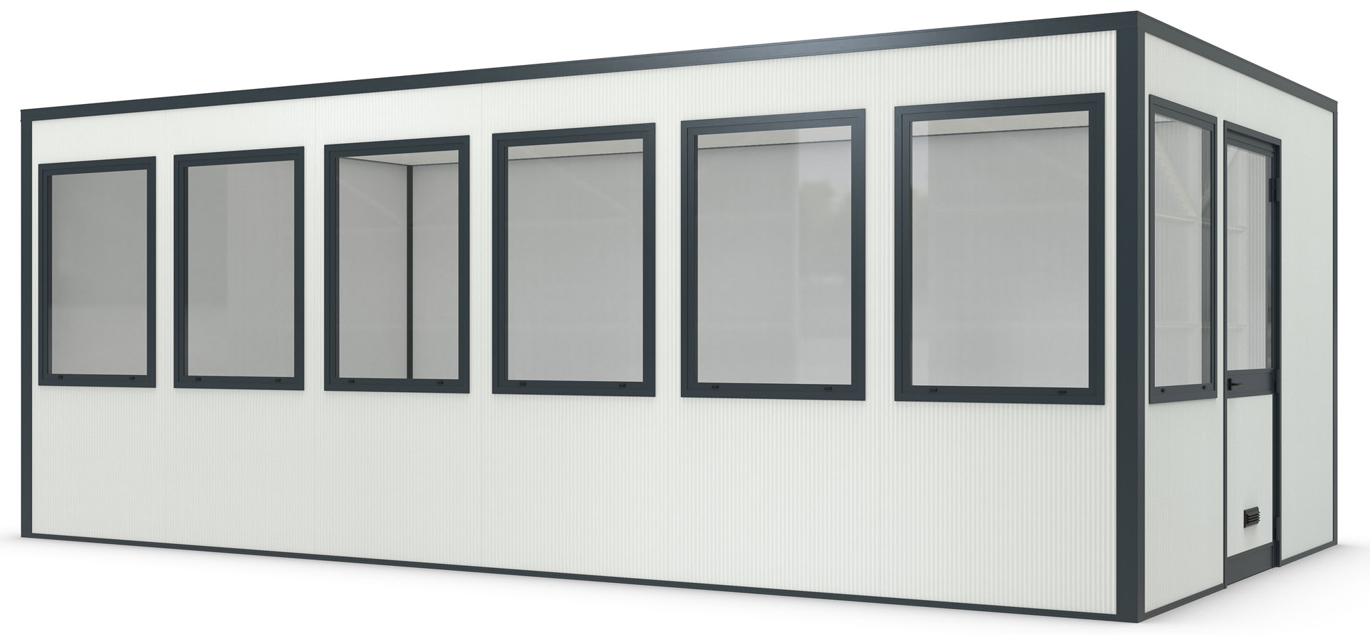 Aufenthaltsraum mit Fenstern | Mobiles Hallenbüro ohne Boden als Nut-Feder-Stecksystem für den Innenbereich